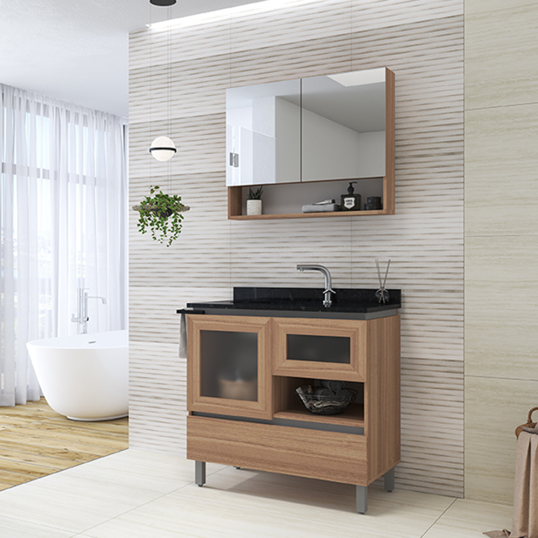 O conjunto Verre foi desenvolvido pensando em compor espaços elegantes, práticos e inteligentes. O móvel apresenta diversos compartimentos que otimizam a armazenagem do dia a dia. Com tampo em pedra natural, suporte toalheiro, ampla cuba de louça embutida e pés com regulagem de altura o conjunto agrega beleza e harmonia em diversos estilos de banheiro.